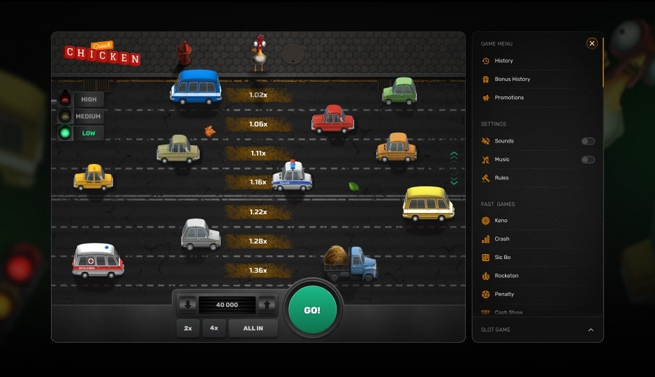Chicken Crash is a crash-style game like no other, where the road is dangerous, the chicken is brave, and every step could be your biggest win yet. Set in a playful urban world, this interactive game blends arcade-style action with massive win potential. As players dodge traffic and move forward, the multiplier increases, but so does the risk. Will you cash out in time, or push ahead for the ultimate payday?