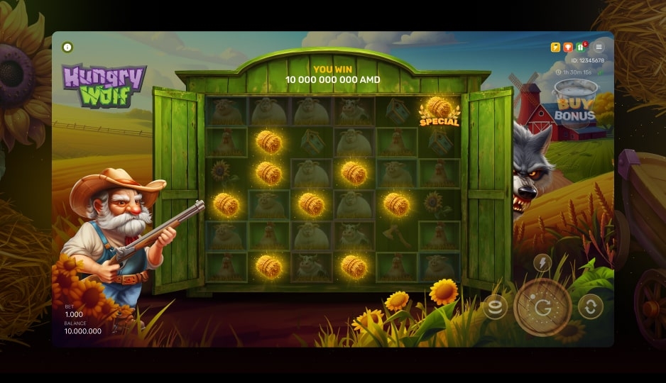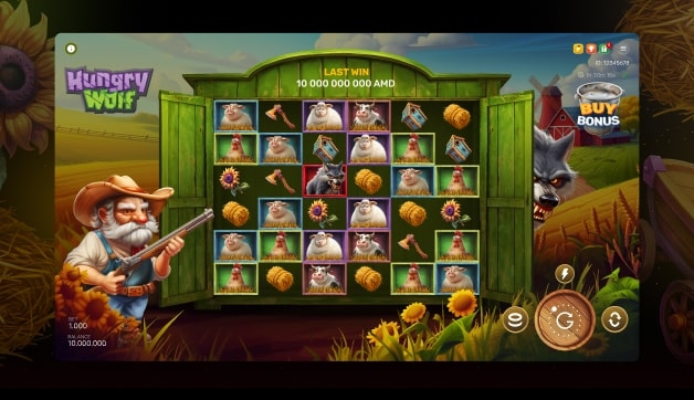 Hungry Wolf is a dynamic 6x6 cascading slot blending forest adventure themes with explosive modern mechanics. Players score wins by matching 6 or more symbols, triggering cascades that unlock fresh combinations. The real thrill ignites when the Wolf appears on the board, dodging the Farmer’s shots to leave Wild symbols in its wake or, when hit, triggering the Bonus Game with 10 free spins and progressive multipliers up to x32. Featuring dramatic showdowns, special symbols that remove low-value icons, and an option to buy direct access to the bonus, Hungry Wolf delivers fast-paced gameplay, powerful rewards, and unmissable excitement with every spin.